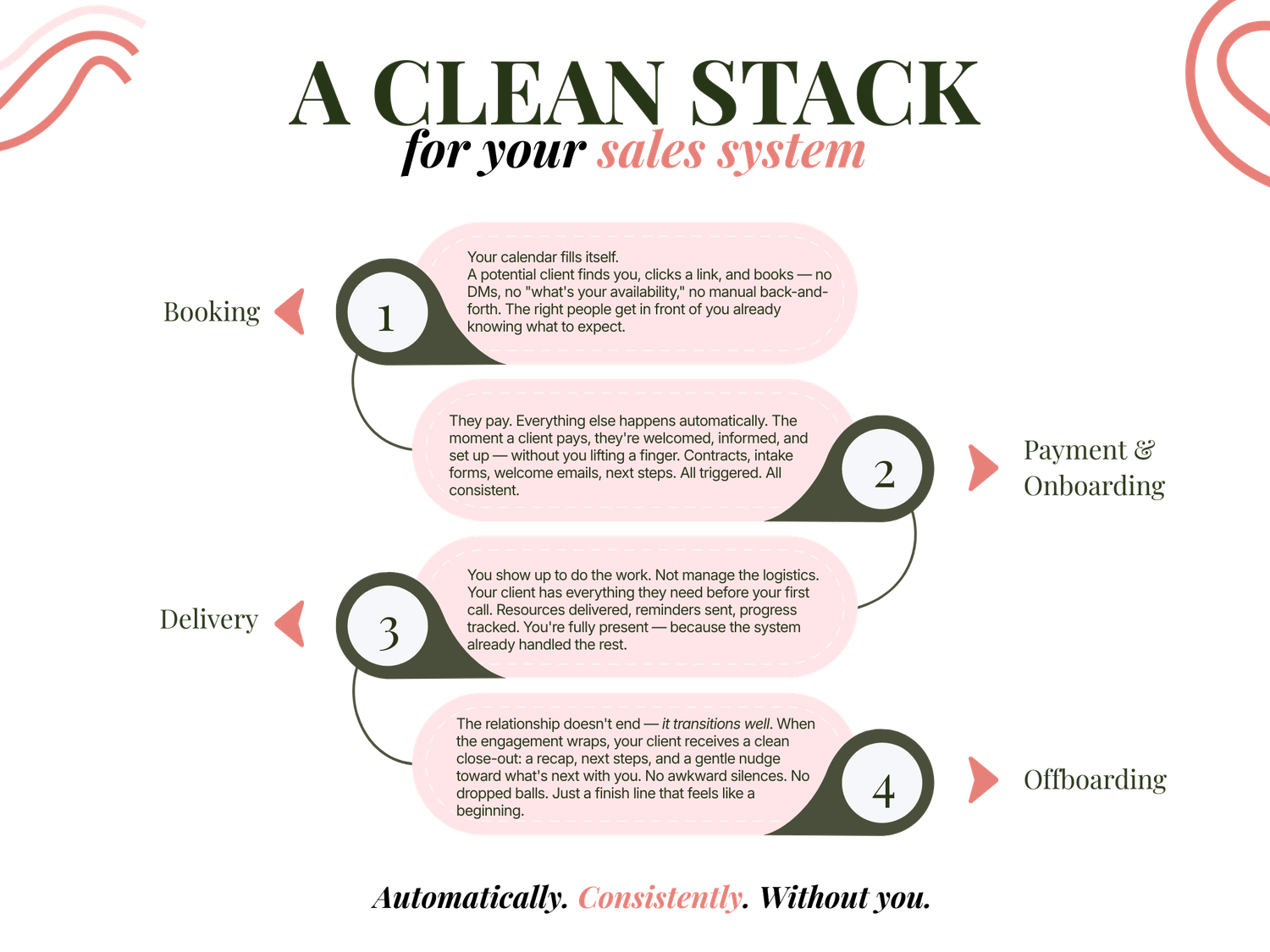 And here's the part nobody says out loud: a leaky backend doesn't just cost you time. It costs you growth. You can't scale to $20k, $50k, $100k months while manually managing a $5k/month operation. Something breaks — your delivery, your energy, your client experience, or all three.